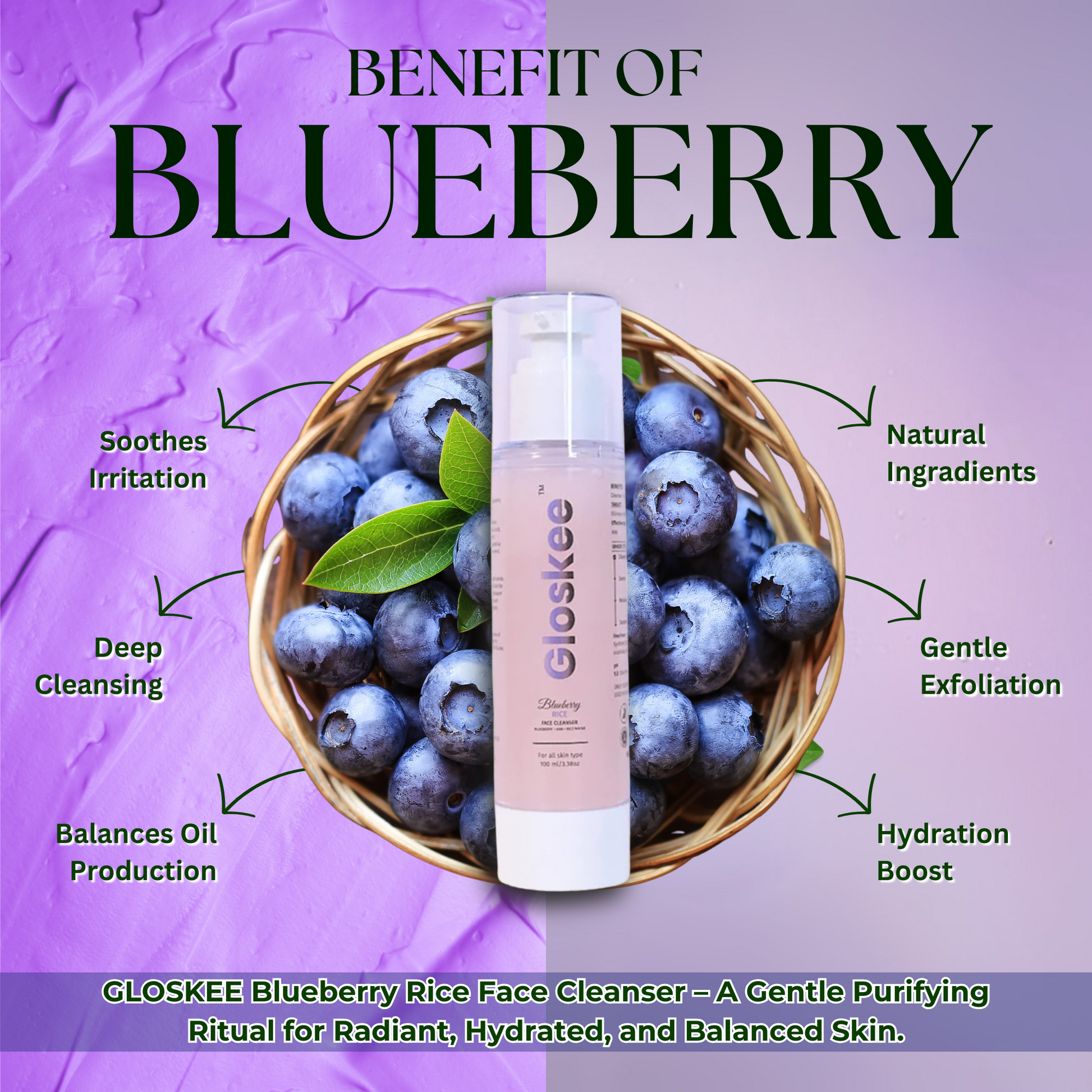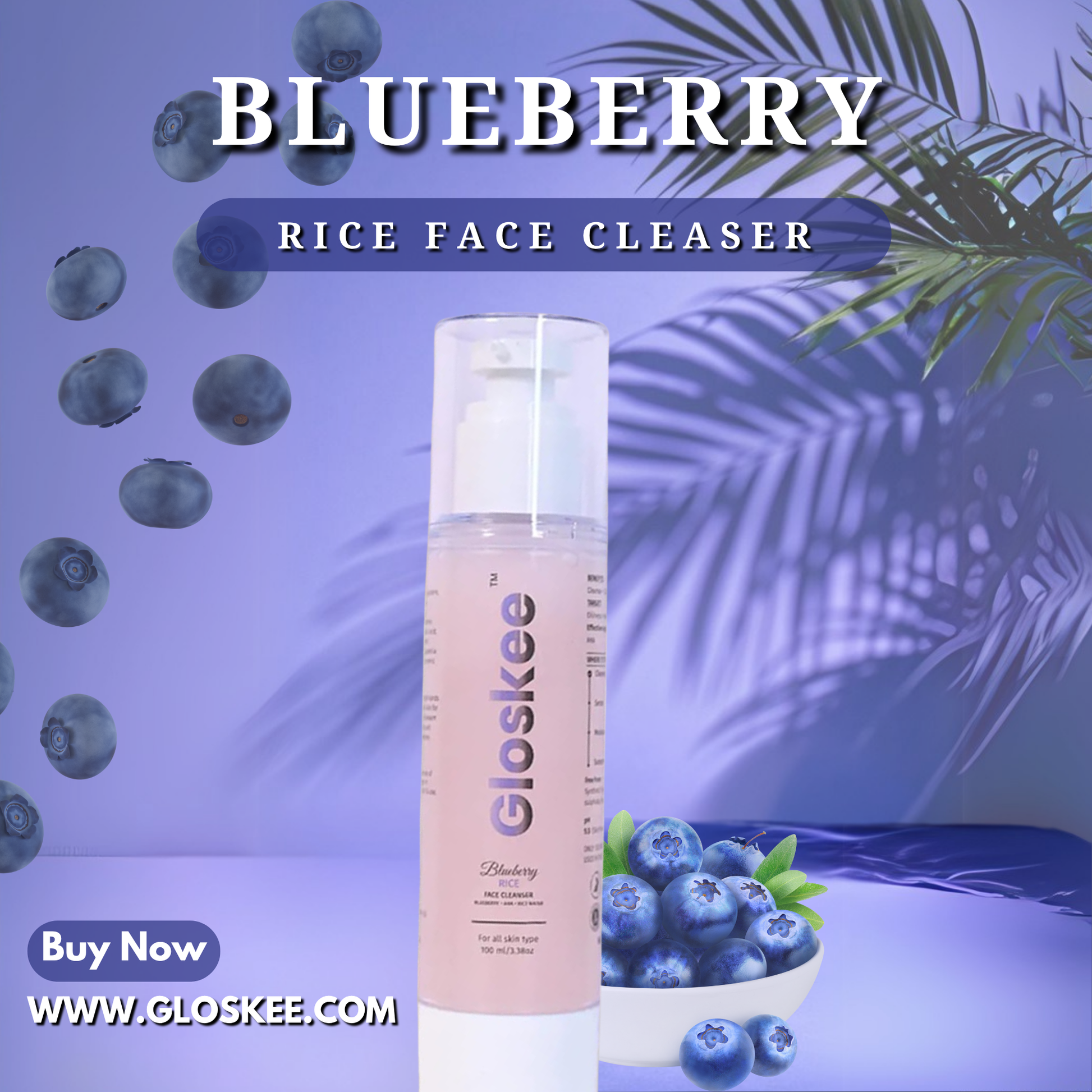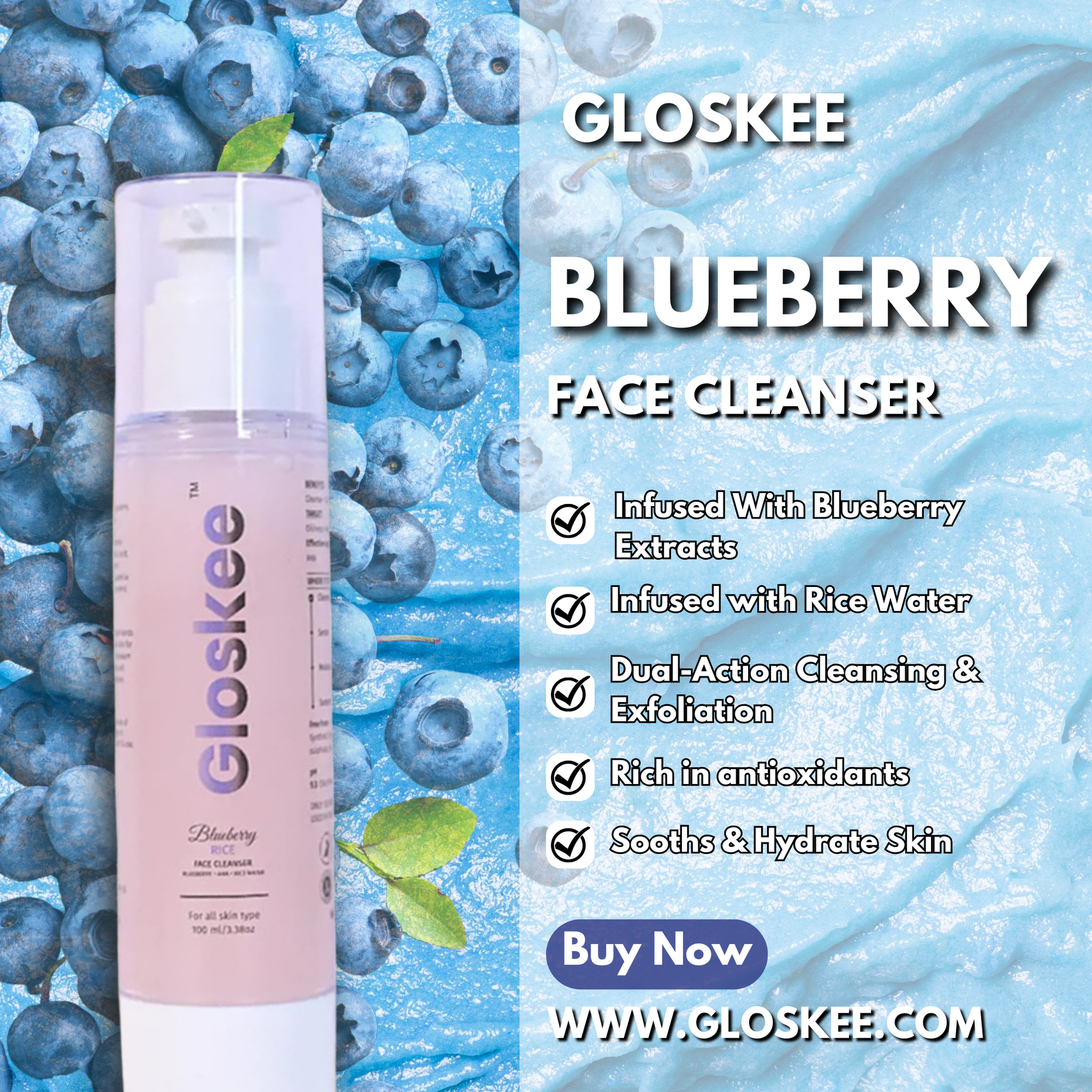 Elevate your skincare routine with the GLOSKEE Blueberry Face Cleanser, a luxurious formula infused with the goodness of nature. This cleanser effortlessly removes dirt, excess oil, and impurities while hydrating and revitalizing your skin. Packed with antioxidant-rich blueberry extract, soothing aloe Vera, and skin repairing niacinamide, itβs designed to cleanse without stripping, leaving you with a fresh and radiant glow.